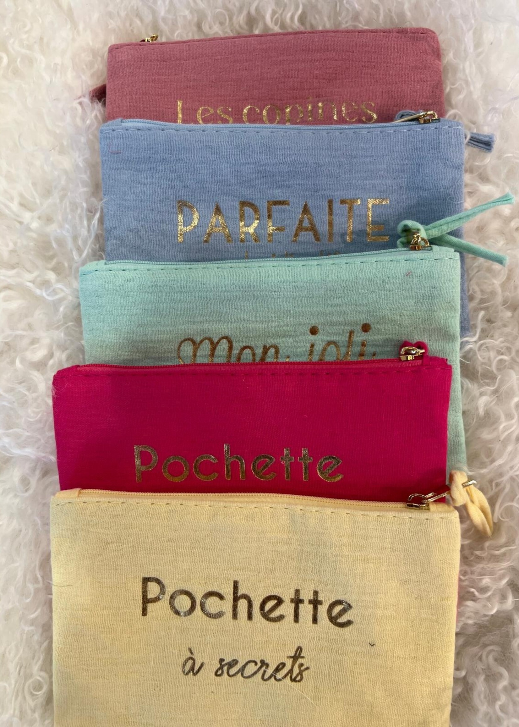 Deze pochette met tekst erop is een stijlvolle en praktische accessoire. Verkrijgbaar in meerdere pastelkleuren, perfect om je essentials in op te bergen en je look een frisse, moderne uitstraling te geven.
